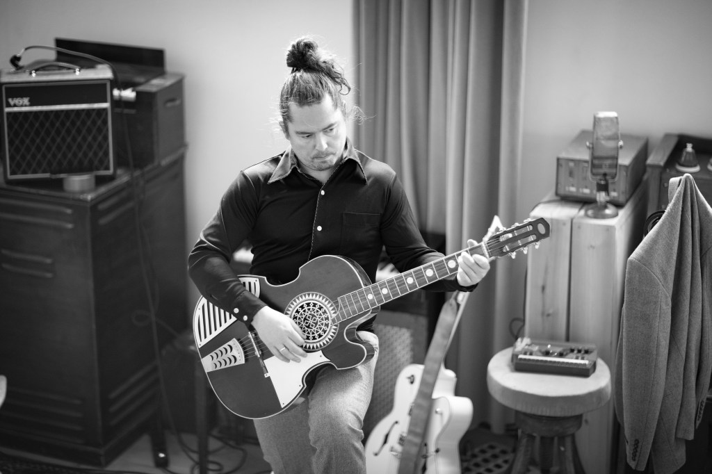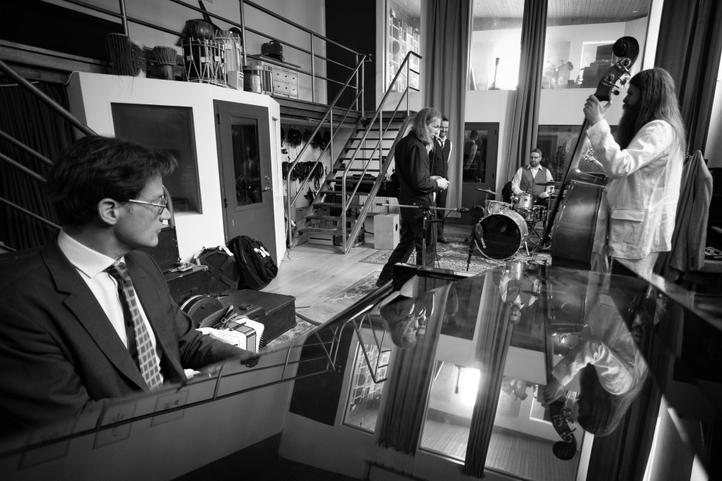 Uppábúnir og vel greiddir hljóðfæraleikarar í fallegu stúdíói þar sem allir gluggar eru ofarlega á veggjum er magnað verkefni fyrir ljósmyndara. Stemmingin sem myndaðist þegar þeir byrjuðu að æfa lögin sem átti að taka upp kom mér í svarthvíta gírinn.